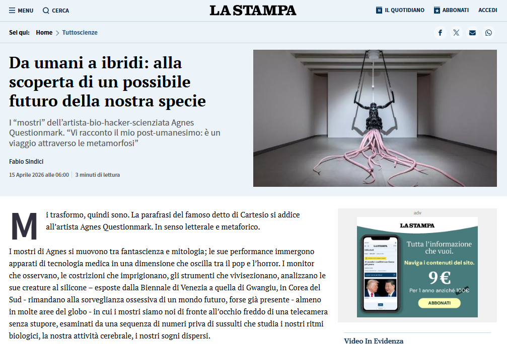 Moving between science fiction and lived reality, Fabio Sindici traces Agnes Questionmark’s “bodies in transformation” , where technology, myth, and identity converge into new hybrid forms. Previously exhibited at AWL Gallery in CAVE (1 November – 28 December 2025) Agnes Questionmark featured in La Stampa (Tuttoscienze) by Fabio Sindici. April 15, 2026.